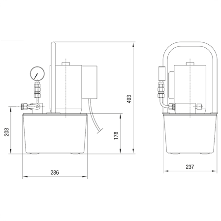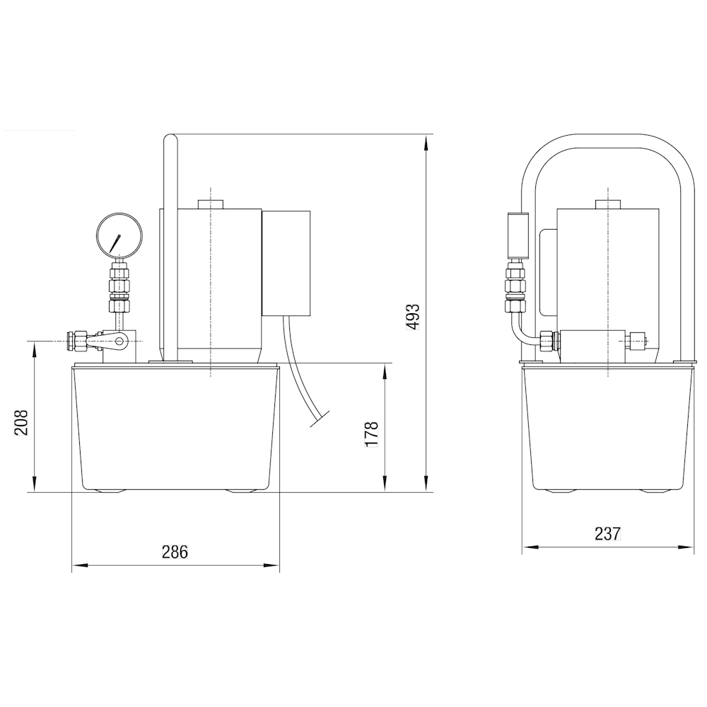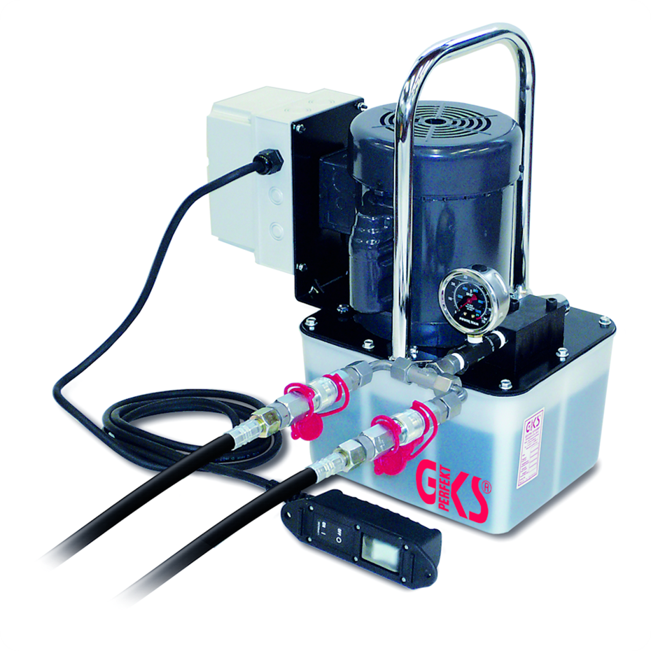 Standardausführung inkl. Fernbedienung, Manometer, 2/2-Wegeventil für einfach wirkende Zylinder und 2x3 m Schläuche mitbeidseitigen, tropffreien Schnellverschlüssen