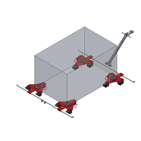 Die RL-Fahrwerke der gleichen Bauhöhe können wie dargestellt als 3-Punkt oder 4-Punkt Auflage mit einer Verbindungsstange und einer Lenkstange kombiniert werden (Option)