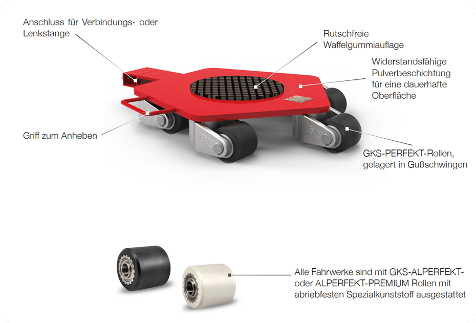 Die GKS-PERFEKT Rotationsfahrwerke sind für 1 bis 12 Tonnen Traglast verfügbar. Durch die spezielle Lagerkonstruktion sind die Rotationsfahrwerke besonders leicht fahrbar und auch auf der Stelle um 360° drehbar. Drei oder vier Fahrwerke werden miteinander eingesetzt. Je nach Situation ist die Kombination mit den Fahrwerken L / F / TL möglich. Mit Verbindungsstangen und Lenkstange lieferbar.
